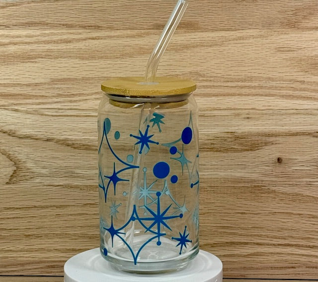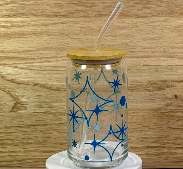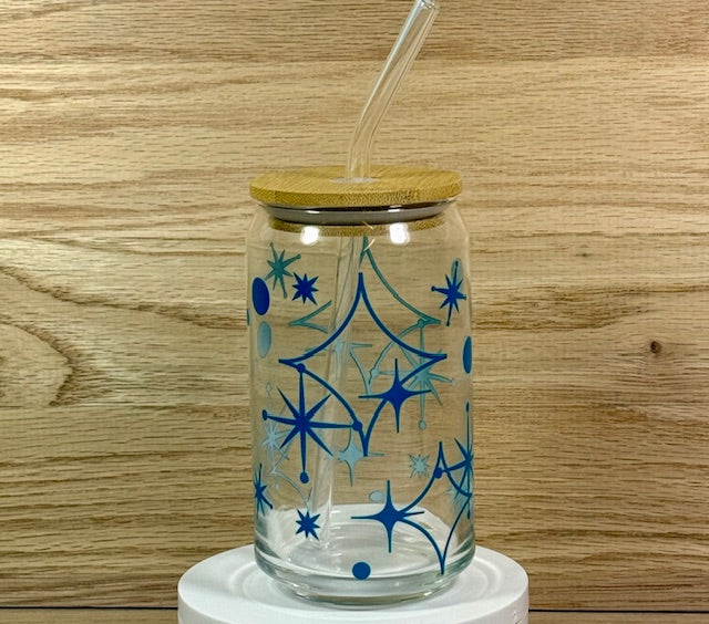 Turquoise Mid-Century Modern Glass with Bamboo Lid and Straw
